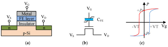 Figure 2a shows the widely studied metal-ferroelectric-insulator-semiconductor (MFIS) FeFET structure, which dopes HfO2 as ferroelectric layer in the gate stack of the transistor. The equivalent circuit is also shown in Figure 2b, where the ferroelectric capacitance (CFE) couples with the capacitance of the underlying MOSFET (CMOS). When the ratio of CFE/CMOS is sufficiently low, the polarization state of the ferroelectric layer can be retained [20], resulting in a hysteresis characteristic curve, as shown in Figure 2c, which generates a storage window for the device.