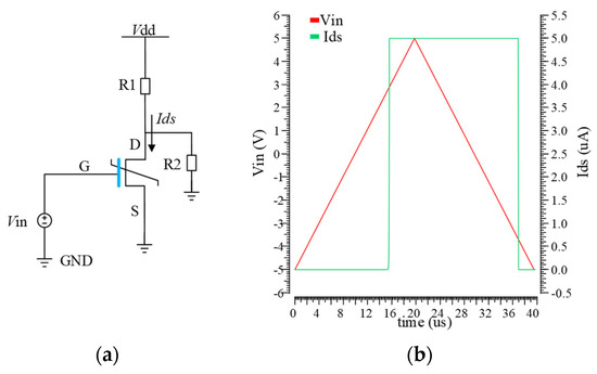 where α, β, and γ are the static coefficients and ρ is a kinetic coefficient associated with the ferroelectric material. In the rest of this paper, the calibrated 10nm model in [23] is used for experimental tests, with 0.25 kinetic coefficient ρ. The FeFET behavior is simulated by combining the self-consistent LK equation with the 180 nm technology model in the Cadence Virtuoso. The switching state of devices can be characterized by measuring the current-voltage (I–V) characteristic using the simulator Spectre, shown in Figure 3.