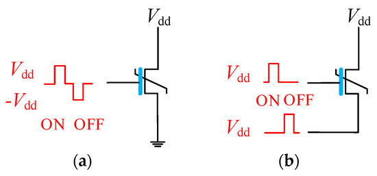 When designing FeFET-based memories, the two switching states of FeFET are generally corresponded to the logical value, so it is necessary to ensure stable state distinction [24]. The traditional solution is to apply positive and negative voltages to the gate for a long time to ensure the correct switching of FeFET, as shown in Figure 4a. However, the negative supply voltage not only increases the hardware cost but also limits the logic cascade. With the advancement of technology, the writing scheme of using gate-source voltage difference has gradually become the mainstream [14]. Figure 4b shows the gate-source writing scheme, where the source of FeFET is connected to the inverted gate voltage during writing to form a positive or negative voltage difference. Though the gate-source writing scheme has extra area overhead, it fully eliminates the need for an additional negative supply voltage and releases the FeFET source terminal as an independent input terminal, which is conducive to expanding the computing power of FeFET [25,26]. Therefore, the gate-source writing scheme is adopted in this paper.