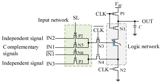 Figure 5 illustrates the basic unit structure evolved from the gate-source writing scheme. The difference between the proposed structure and the normal DL gate is that the logic network is formed by only one NMOS N1 and one FeFET in series. The NMOS N1 is used to isolate the influence of the pre-charge network on the FeFET, and the single FeFET device is used to implement the operation. In addition, an input network is added at the input end of the logic network to transmit multiple input signals to the gate-source of the FeFET in a time-division multiplexed manner. The logical functions that can be implemented by FeFET are determined by the timing voltage signal. The input network is connected to four input ports, of which IN1 and are a pair of complementary signals, and IN2 and IN3 are independent signals. The four input signals are controlled by the selection signal SL through NMOS N5/N6 and PMOS P2/P3, and the complementary signals will act on the gate and source of the FeFET, respectively, for setting the initial state of the FeFET. The two independent signals will be transmitted to the gate and source of the initialized FeFET, and the initial state of the FeFET will be maintained or switched according to the voltage difference in the independent signals. The final state of FeFET is uniquely determined by the input signals and reflects the operation process.