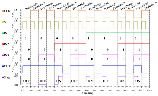 The sequential operation of implementing logic functions based on the unit circuit is shown in Figure 6, where the calculation occurs in the pre-charge phase (CLK is low, corresponding to steps 1–3), and the reading of the logic result occurs in the evaluation phase (CLK is high, corresponding to step 4). In the pre-charge stage, a pair of complementary voltages IN1 and first determine the state of the FeFET (SL is high, corresponding to step 2), and then the independent voltages IN2 and IN3 are calculated with the specific state (SL is low, corresponding to step 3). Since the complementary voltage is consistent with the independent voltage and the range of the output voltage, the logic operations performed on the unit circuit can unify the form and range of the logic inputs and overcome the overhead of additional conversion circuits. According to the simulation waveform, in the evaluation phase, if the FeFET is in the ON state, a conductive path will be established between Vdd and GND, otherwise, the output is maintained in the pre-charge phase equal to Vdd. The state of the FeFET is determined by the three inputs, so the unit circuit can realize the following functions: