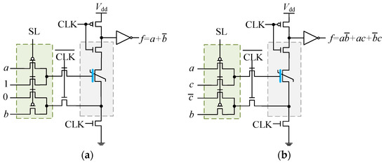 In order to ensure the complete non-volatility of the calculation results, the logic network of the unit circuit can only be composed of non-volatile devices. Therefore, the change in different logic functions is completely realized by adjusting the input signals and the series or parallel connection of FeFETs in the logic network. Let a, b, c, … represent binary signals, whose values “1” or “0” indicate the high or low voltage signals. In the unit circuit, the input network connects three independent inputs (one of which corresponds to the pair of complementary signals), and the output is connected to an inverter for shaping. The constant logic operation and variable logic operation based on them are shown in Figure 7.
