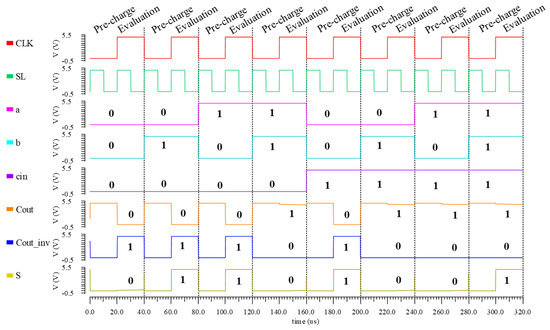 According to (4), Cout can be obtained through a BM gate, so we use the unit circuit to replace the carry output part constructed by NMOS gates in traditional DL FA circuits. In order to ensure that the output of can normally control the NMOS that constitutes the output sum during the evaluation phase, FeFET is used to calculate and store the operation result of . The overall circuit is shown in Figure 10.