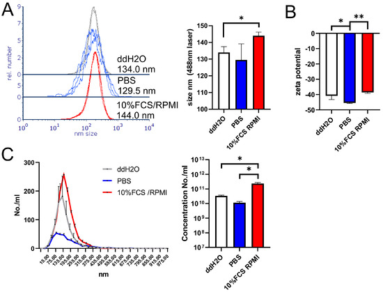 The size and zeta potential were analyzed using ZetaView Software (version 8.05.16 SP3) with the following parameters: maximum area: 1000, minimum area: 10, and minimum brightness: 30. Particle concentration was calculated after subtracting blank controls. Exported Flow Cytometry Standard (FCS) files were analyzed using FCSExpress 7 (DeNovo Software, Pasadena, CA, USA), and summary graphs were created with GraphPad Prism (version 8.0).