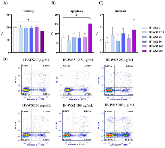 The possible cytotoxic effect of IF-WS2 on PBMCs was further studied using an apoptosis/necrosis assay. The results confirmed the findings of the viability studies and showed the absence of cytotoxicity up to 100 µg/mL. The highest concentration (200 µg/mL) showed a slight increase in the percentage of apoptotic cells (13.3 ± 2.8%) compared to the control (7.3 ± 2.5%) (p < 0.05) (Figure 2B), with no significant effect on cell necrosis (Figure 2C). Flow cytometric data from one representative experiment (Figure 2D) showed a predominant increase in early apoptotic (Annexin-V-FITC+/PI-) cells in the presence of the highest concentration of IF-WS2.