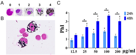 Internalization of IF-WS2 nanoparticles (observed as black intracellular granules) was evaluated using a semiquantitative phagocytic index (PhI): PhI: 0: No stained granules; PhI: 1: Low number of small stained granules; PhI: 2: Moderate number of small and large stained granules; PhI: 3: High number of mostly large stained granules; PhI: 4: Very strong positivity, cells completely filled with dense granules. Details are provided in Section 3. The mean PhI was calculated by dividing the total internalization score by the total number of analyzed cells.
