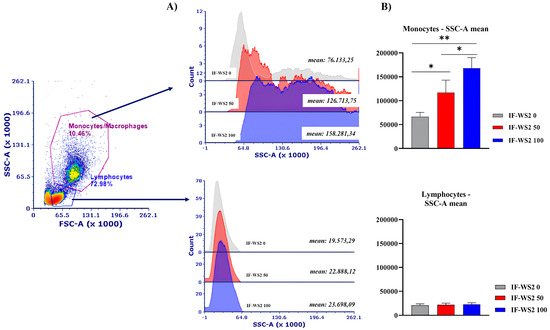 Internalization of IF-WS2 by PBMCs in culture. PBMCs were cultured with IF-WS2 for 24 h, followed by analysis by flow cytometry. (A) Gating strategy showing the population of monocytes/macrophages (above) and lymphocytes (below). (B) Mean values of size scatter for each population (monocytes/macrophages above, lymphocytes below) are presented. Data are shown as mean ± SD (n = 3), with representative histograms included. * p < 0.05; ** p < 0.01 as indicated on the horizontal bars (one-way ANOVA).