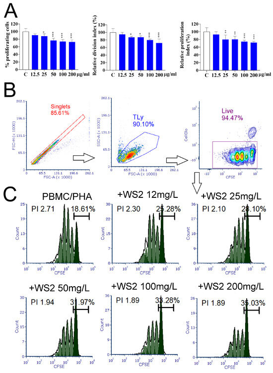 PBMCs prestained with CellTrace Far Red were stimulated with PHA for 96 h. Experimental cultures were treated with five different concentrations of IF-WS2 (12.5, 25, 50, 100, and 200 µg/mL). Afterward, cell proliferation was analyzed using a flow cytometer. Several parameters, such as PI, DI, and the percentage of proliferating cells, were determined and expressed as relative values, with 100% representing the parameters in the control (Figure 5A). It can be observed that IF-WS2 concentrations of 25 µg/mL and higher inhibited cell proliferation. The inhibition ranged from 26.4% to 32.6% at the highest concentration, depending on the parameter investigated (p < 0.005). Representative histograms from one experiment are shown in Figure 5B.
