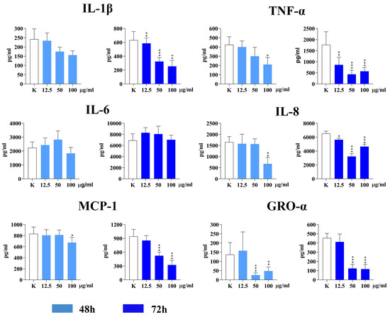 No significant changes in the levels of IL-1β and IL-6 were observed after 48 h. However, the levels of TNF-α, IL-8, and MCP-1 were significantly lower at the concentration of 100 µg/mL (p < 0.05) compared to control cultures. Additionally, GRO-α levels were most significantly decreased at 50 and 100 µg/mL (p < 0.005 and p < 0.01, respectively).