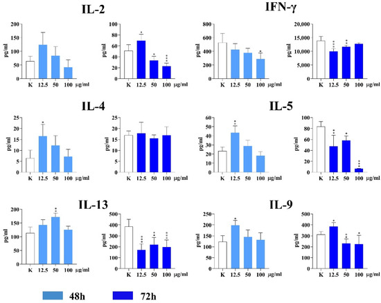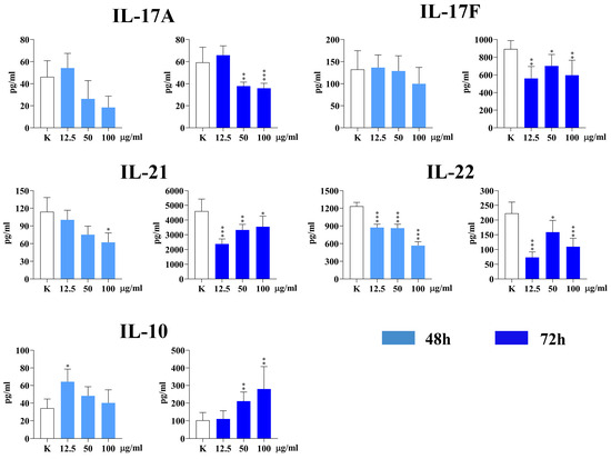 Regarding Th17 cytokines, only IL-22 was significantly decreased after 48 h in the presence of all concentrations of IF-WS2 (p < 0.005). However, the levels of all three Th17 cytokines were decreased after 72 h.