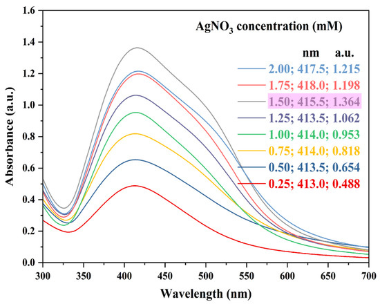 Ag precursor (AgNO3) concentration used in the present study was in the range of 0.25 to 2.00 mM. From the results (Figure 2), it was evident that as the concentration of metal (AgNO3) precursor increased, the wavelength (i.e., maximum absorption peak) of the samples also increased, causing a red shift [57]. The peak intensity (absorbance values) for the 1.75 mM and 2.00 mM Ag precursor samples was reduced because the AgNPs preferred growth over additional nucleation [60,62]. Therefore, a Ag precursor concentration of 1.50 mM was chosen for further experiments.