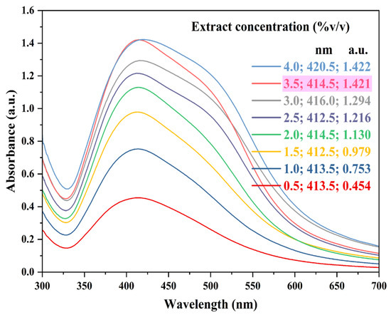 UV-Vis absorption spectra representing AgNPs synthesis at various extract (ACCE) concentrations. Reaction conditions: AgNO3 concentration—1.50 mM; ACCE concentration—0.5, 1.0, 1.5, 2.0, 2.5, 3.0, 3.5, and 4.0% v/v; reaction temperature—RT; reaction pH—6.5 to 7.0; and reaction time—30 min. Pink highlight indicates the extract concentration chosen for further experiments.