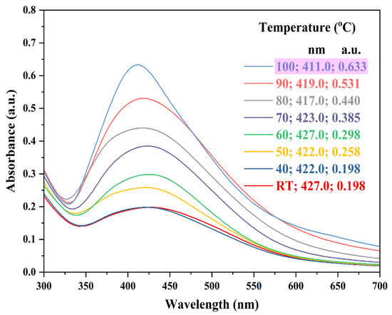 The reaction temperature used in the present study was in the range of RT to 100 °C. From the results (Figure 4), it was evident that as the reaction temperature increased, the wavelength (i.e., maximum absorption peak) of the samples decreased, causing a blue shift [59,69,70]. Absorbance values were increased from 0.198 to 0.633 a.u. for RT to 100 °C. Therefore, a reaction temperature of 100 °C was chosen for further experiments.
