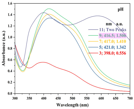 The reaction pH used in the present study was in the range of 3 to 11. From the results (Figure 5), it was evident that as the reaction pH increased, the wavelength (i.e., maximum absorption peak) of the samples decreased, causing a blue shift, overall. At a pH of 3, no visible AgNPs formation, i.e., color change, was observed [56]. Previous studies suggest that anionic repulsion in the solution might be responsible for the slow synthesis and accumulation of AgNPs at lower pH levels [59]. A pH of 11 showed two peaks at 400 nm (1.437 a.u.) and 588 nm (1.38 a.u.). A peak at 400 nm was typically associated with the surface plasmon resonance (SPR) of AgNPs [60,61,62,75]. The SPR is a collective oscillation of free electrons in response to incident light, which enhances the absorption of light at specific wavelengths. A peak at 588 nm may indicate the presence of larger AgNPs or agglomerates. As the size of the AgNPs increases, the SPR peak shifts to longer wavelengths (red shift) [70,76]. The peak at 588 nm can signify the formation of larger clusters or a more complex particle size distribution. The higher pH can also influence the surface charge of the AgNPs, leading to varying degrees of aggregation, which can contribute to the presence of multiple peaks in the spectrum [77]. A similar observation was reported by Handayani et al. [77], when two peaks were observed at a pH of 11 near 422 nm and 673 nm. Therefore, a reaction pH of 9 was chosen for further experiments.