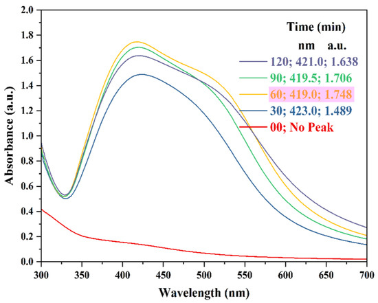The reaction time used in the present study was in the range of 0 to 120 min. From the results (Figure 6), it was evident that no immediate AgNPs synthesis was observed in the reaction mixture at 0 min. The reduced absorbance peaks observed at longer reaction times (90 and 120 min) were attributed to the aggregation of AgNPs rather than continued nucleation as the reaction time increased [60,62]. Therefore, a reaction time of 60 min was chosen.