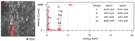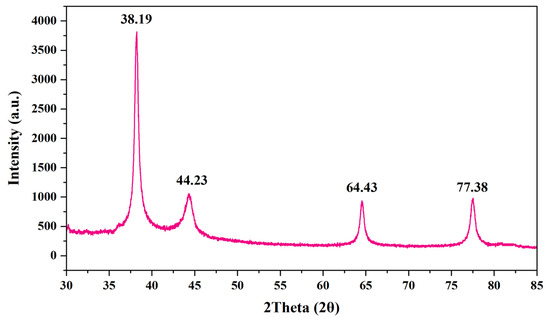 where D is the size of the crystallites in nm; κ is the shape factor of the AgNPs, which is 0.94; λ is the X-ray wavelength of Cu Kα, which is 0.154 nm; β is the FWMH measured in radians; and θ is the Bragg angle of the peaks measured in radians. The peak position (2θ) and FWMH were determined by using OriginPro 2024b software (Northampton, MA, USA).