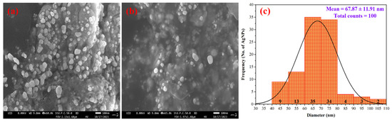 UV-Vis spec (Model: UV-1800; Manufacturer: Shimadzu, Kyoto, Japan) was used to record the absorbance spectra from 300 to 700 nm for all synthesis experiments. The particle size distribution (PSD) and zeta potential (ZP) analysis of the synthesized AgNPs was studied using a particle analyzer (Model: LiteSeizer 500; Manufacturer: Anton Paar, Graz, Austria) [38]. DLS is a technique used to determine the PSD and polydispersity index (PDI) of AgNPs in solution. It measures the fluctuations in light scattering due to Brownian motion, providing insights into the hydrodynamic diameter of the AgNPs. ZP assesses the surface charge of AgNPs, indicating their stability in suspension. A higher absolute value of ZP signifies stronger electrostatic repulsion between particles, which can prevent aggregation and enhance colloidal stability [38]. XRD (Model: X’Pert Pro; Manufacturer: Malvern PANalytical, Malvern, UK) was used for analyzing the crystalline structure of AgNPs. It provides information about the phase purity, crystallite size, and lattice parameters by examining the diffraction patterns produced when X-rays interact with the crystal lattice of the AgNPs. The approximate crystallite size can be determined using Debye–Scherrer’s equation (Equation (1)), which is recognized as one of the most fundamental and commonly used methods for calculating particle size, utilizing the 2θ and FWHM values obtained from the XRD data [39]. AgNPs powder was placed on a carbon grid, gold coated using a sputter coater. Then, the surface morphology, size, and shape were observed using FE-SEM (Hitachi S-4500; Chiyoda, Japan). Element composition was studied by using EDX coupled with FE-SEM. TEM (Model: Tecnai 10; Manufacturer: Philips, Amsterdam, The Netherlands) allows for the high-resolution imaging of AgNPs, providing detailed information on their morphology, size, and distribution. This technique involves transmitting electrons through a thin sample, enabling the visualization of the internal structure and the shape of AgNPs at the nanoscale [40].