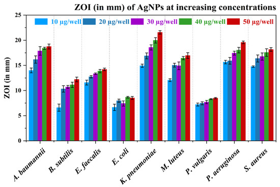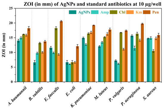 In this in vitro method, agar plates inoculated with bacterial strains were prepared, and wells were made using sterile well borer (diameter 6 mm). AgNPs (stock solution of 1 mg/mL) were loaded at different volumes (10 µL, 20 µL, 30 µL, 40 µL, and 50 µL) and labeled (10 µg, 20 µg, 30 µg, 40 µg, and 50 µg) accordingly. Standard antibiotics (Amp, Chl, Km, and Pen) were loaded at 10 µL (stock solution of 1 mg/mL). The plates were then incubated, typically at 37 °C for 24 h, allowing the AgNPs to diffuse into the agar. The antibacterial activity is indicated by a clear zone of inhibition (ZOI) surrounding the wells, where bacterial growth has been prevented. The size of these ZOIs correlates with the effectiveness of the AgNPs against the test bacteria [40].