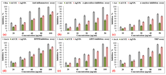 The assay evaluates the ability of the synthesized AgNPs to inhibit protein denaturation, which is an important anti-inflammatory mechanism. Protein denaturation often correlates with inflammation, so compounds that prevent or inhibit this process are considered to have anti-inflammatory properties. Fresh chicken egg white is mixed with 0.5 M Tris-HCl buffer (pH 7.07) at a 1:4 ratio to reduce its viscosity. Each reaction tube contains: 0.2 mL of egg white solution, 1.8 mL of Tris-HCl buffer, and various concentrations of AgNPs. Incubate the reaction mixture for 15 min at 37 °C. Followed by heating the mixture at 80 °C for 5 min in a water bath. Cool the samples and measure their absorbance at 660 nm. Ibuprofen (Ibu) and ACCE were used as positive and negative controls, respectively. The protein denaturation inhibition (PrDI) percentage was calculated using Equation (2) [41].