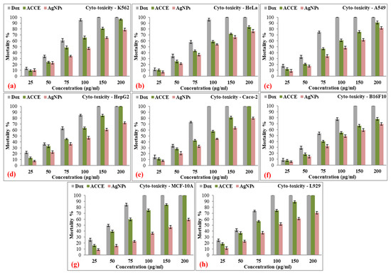 A cell suspension containing approximately 20,000 cells in 100 µL was prepared and transferred into the wells of a 96-well plate. The plates were incubated for 24 h under controlled conditions (37 °C in a 5% CO2 incubator) to allow the cells to adhere and grow. After incubation, 100 µL of freshly prepared AgNPs solutions at increasing concentrations (25, 50, 75, 100, 150, and 200 µg/mL in RPMI 1640 media (HiMedia, Hyderabad, India)) was added to the respective wells, and each well was labeled accordingly. The plates were then incubated for an additional 48 h under the same conditions. Following the second incubation, 20 µL of MTT solution (5 mg/mL in phosphate-buffer saline) was added to each well and incubated for 4 h under the same conditions. This step leads to the formation of purple formazan crystals as a result of viable cell metabolism. After the incubation, the cell suspensions were carefully discarded without disturbing the formed formazan crystals. To dissolve the formazan crystals, 200 µL of dimethyl sulfoxide solvent was added to each well. The absorbance of the wells was then measured at 570 nm using a 96-well plate reader to quantify the amount of formazan produced. Doxorubicin (Dox) and ACCE were used as positive and negative controls, respectively. The cell mortality percentage was calculated using Equation (6) [44].