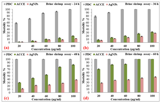Brine shrimp eggs were incubated in a beaker containing 3% rock salt water for 48 h. Aeration was provided continuously using an air pump. Once the eggs hatched, live Artemia nauplii were collected using a Pasteur pipette for the bio-assay. Each bio-assay test tube contained 3 mL of rock salt water and precisely 20 live brine shrimp. Incremental volumes of AgNPs (20, 40, 60, 80, and 100 µg/mL) were added from a stock solution (1 mg/mL) to each test tube to test the AgNPs’ effect at varying concentrations. The bio-assay was conducted at RT with the brine shrimp exposed to the AgNPs. After 24, 36, 48, and 60 h of incubation, the test tubes were observed, and the number of live brine shrimp was recorded. The mortality percentage was calculated using Equation (7) [40].