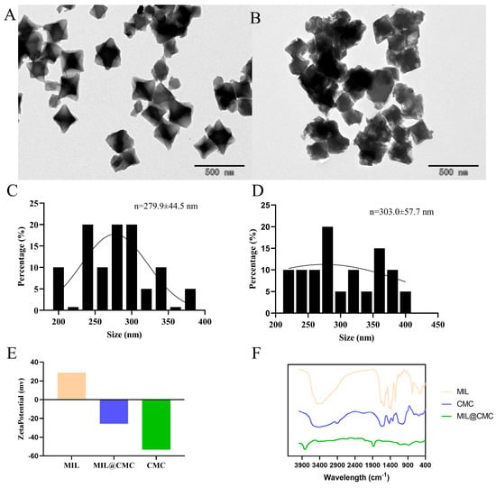 As shown in the TEM images, a clear morphological distinction is observed between MIL (Figure 1A and Figure S2(A1,A2)) and MIL@CMC (Figure 1B and Figure S2(B1,B2)). Figure S1 shows a schematic diagram of the preparation process for MIL and MIL@CMC. The particles of MIL exhibit a rhombic, regular crystal structure, suggesting a high degree of crystallinity. In the absence of additional modification, the particle size of MIL is relatively small, with individual particles measuring approximately 279.9 nm (Figure 1C). This regular morphology is a result of the formation of MIL [40]. In contrast, the particle size of MIL modified with CMC increased to approximately 303.0 nm (Figure 1D). The MIL@CMC particles exhibit a more irregular shape, a rougher surface, and signs of agglomeration, indicating that the introduction of CMC altered the surface morphology of MIL, leading to the loss of the regular particle arrangement [22,41]. Figure S2C,D show the hydration kinetic diameters of MIL and MIL@CMC, as measured with DLS, which are 859.2 nm and 840.27 nm, respectively. The discrepancy between the DLS data and TEM analysis, in which the particle size of MIL@CMC appears smaller in DLS measurements, can be attributed to several factors. Previous studies have shown that particle size measurements obtained through DLS tend to be larger than those derived from electron microscopy. We hypothesize that this discrepancy, along with the inherent heterogeneity of the materials, contributes to the observed differences in particle size between DLS and TEM analyses. The zeta potential data further suggest that CMC modification significantly alters the surface charge of MIL. The zeta potential of unmodified MIL is +28.8 mV, while that of the modified material is −25.7 mV (Figure 1E). A larger absolute zeta potential generally correlates with increased stability and a reduced tendency for agglomeration. Therefore, as shown in Figure 1B, more pronounced agglomeration is observed in the modified material.
