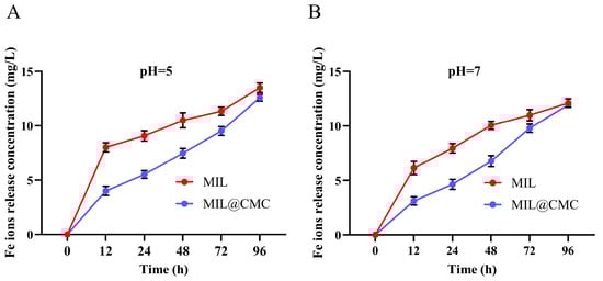 Although CMC modification reduced the release of Fe ions at both pH values, the inhibitory effect was relatively small at pH 7, which may indicate that CMC has better stability and structure in non-acidic conditions. Acidic conditions could promote the release of iron ions. Marcuello et al. found that increasing humidity improves the adhesion between lignocellulose and cellulose nanocrystals prepared using glucomannan. In addition, an increase in humidity decreases the reduced Young’s modulus of lignocellulosic films while increasing the water adsorption capacity of this polymer film [47]. Nikiforov et al. prepared dialdehyde cellulose through chemical modification of short flax fiber using sodium metaperiodate. It was shown that the adsorption capacity of the modified prepared cellulose for Cu2+, Cd2+, and Fe2+ was increased by about 2.4–2.9 times [48]. Therefore, in addition to CMC potentially slowing the release of Fe ions by enhancing the stability of MOFs, another possible mechanism is that carboxymethyl cellulose may have some adsorption effect on Fe ions. As a result, fewer Fe ions are detected from the release of MIL@CMC compared to MIL.