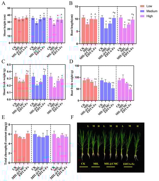 The plant height (A), root length (B), fresh weight of the aboveground parts (C), fresh weight of the roots (D), and chlorophyll content (E) of rice seedlings after 15 days of exposure to varying concentrations of MIL or MIL@CMC. Rice seedlings exposed to different concentrations of MIL or MIL@CMC for 15 days (F). Data are expressed as the mean ± SD (n = 3). (* p < 0.05 vs. CK, ^ p < 0.05 vs. MIL, Τ p < 0.05 vs. MIL@CMC.)