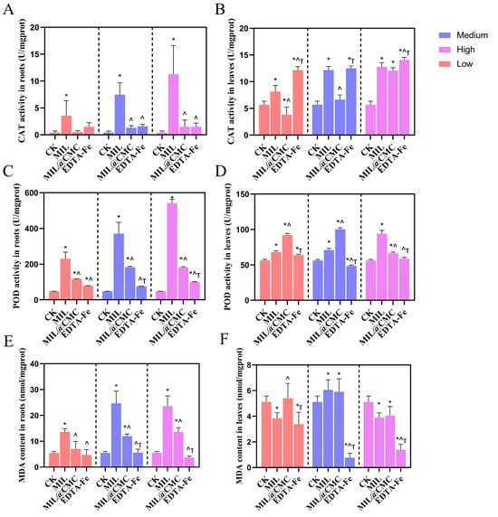CAT enzyme (A,B) and POD enzyme (C,D) activities and MDA contents (E,F) in rice leaves and roots after 15 days of exposure to different concentrations of MIL or MIL@CMC. Data are expressed as the mean ± SD. Data are expressed as the mean ± SD (n = 3). (* p < 0.05 vs. CK, ^ p < 0.05 vs. MIL, Τ p < 0.05 vs. MIL@CMC.)