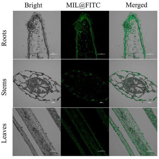 CLSM images of different parts of rice seedlings (stems, roots, and leaves) treated with MIL@FITC.