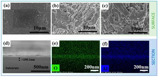 SEM surface morphology of stainless steel before and after modification: (a) pretreated 304 stainless steel substrate, (b) nitric acid passivation, (c) the nitric-acid-passivated sample after the deposition of Al2O3 film by ALD, (d) cross-sectional SEM image of the ALD-coated sample, (e) cross-sectional EDS map of element O of the ALD-coated sample, (f) cross-sectional EDS map of element Al of the ALD-coated sample.
