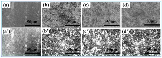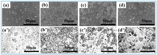 SEM and grayscale images of nitric acid passivation sample after processing: (a,a′) 304-S, (b,b′) 30-N, (c,c′) 50-N, (d,d′) 70-N.