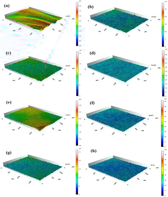 Laser confocal test results of different samples: (a) 304-S, (b) 30-N, (c) 50-N, (d) 70-N, (e) 304-SA, (f) 30-NA, (g) 50-NA, (h) 50-NA.