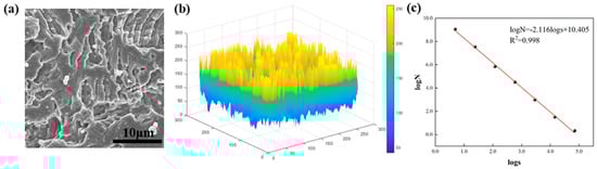 The accuracy of fractal dimension analysis can be affected by the resolution of the data; lower resolutions may lead to an underestimation of the surface complexity, while higher resolutions may introduce noise that affects the results. Furthermore, fractal dimension calculations are sensitive to the scale range used in the analysis, and if the scale range is not chosen properly, the true fractal behavior of the surface may not be captured. To address these limitations, we combined fractal dimension analysis with SEM images with high resolution and carefully selected the scale range based on preliminary analysis. Figure 8 shows the calculation process of the fractal dimensions. Taking the 70-NA sample as an example, the SEM image of the sample with the size of 256 × 256 × 8 bit is given, and the grayscale surface information extraction and binarization are processed by MATLAB programming software. The extracted gray scale surface represents the gray value distribution of the SEM image, which is used to characterize the surface morphology of the modified stainless steel. The grayscale intensity in the SEM image is converted into a three-dimensional surface, where the x and y axes correspond to the spatial pixel coordinates (unit: pixels, size: 256 × 256), and the z axis represents the grayscale intensity (unit: dimensionless, ranging from 0 to 255) which correlates with the relative height variations of the surface morphology. And finally, the fractal dimension of this image can be calculated. To ensure the accuracy and consistency of the results, the process was repeated several times on different images and the average of the fractal dimensions was taken after the calculation. As can be seen in Figure 8c, a logs–logN plot of s and N is created, and the fitted result for the fractal dimension D is determined as 2.116 and the calculated linear correlation coefficient R2 = 0.998, indicating the good correlation of the logs–logN, and the image has good fractal characteristics in the range of computational scales. Those results prove that it is feasible to use the fractal dimension to quantitatively describe the morphological characteristics of the modified surface of stainless steel.