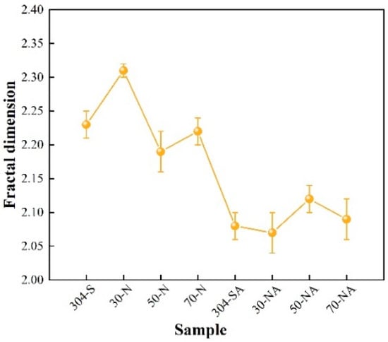 The value of the fractal dimension (D) indicates the degree of irregularity, self-similarity, and spatial filling of the surface. A larger D value corresponds to a more complex shape and rich microstructural details of the surface. It can be seen from Figure 9 that the fractal dimensions of the samples after the ALD alumina coating are smaller than those of the nitric acid pickling passivation samples. Especially, the samples of 50-N and 30-NA show the smallest fractal dimensions because of the relatively simple surface morphology. It can be seen that the variation in the fractal dimension is inconsistent with the surface roughness, but it is basically consistent with the island structural feature, internal lamellar structure size, and film coverage results shown above.