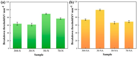 The vacuum breakdown threshold of the samples is shown in Figure 11. The results proved that pickling passivation treatment can effectively improve the breakdown threshold of stainless steel electrodes. Especially, the sample passivated for 50 min exhibits the highest breakdown threshold up to 89.6 kV/mm, and the breakdown threshold is further improved to 99.3 kV/mm after ALD deposition. The sequential enhancement of the breakdown performance can be attributed to the improvement in insulating properties and the reduction in electron emission probability. Previous studies have shown that metal electrode surface structures characterized by high roughness and tip bumps enhance field emission and lower the breakdown threshold [12]. Our study shows that taking advantage of uniform treatment, deep removing the sharp wedges and grooves, and effective reduction in microscopic bumps on the electrode surface by pickling passivation, the field enhancement factor of the electrodes is effectively reduced, and the breakdown strength of the electrodes in the vacuum gap is enhanced remarkably, which is in agreement with what has been described in the previous literature. However, when the pickling passivation time exceeds 50 min, the electrode surface is over-acid-pickling-passivated, which leads to the destruction of the uniform structures, and the newly formed bumps will lead to greatly enhanced field emissions, and therefore the electrode breakdown resistance is reduced. The nitric-acid-passivated 30 min sample after the deposition of Al2O3 film by ALD has the maximum breakdown threshold. This is because Al2O3 film has excellent insulating properties [24], and Al2O3 film closes the defects on the surface of the electrode after passivation, allowing this high-performance dielectric film to become a physical barrier to the movement and collision of electrons, effectively reducing the flashover voltage scattering and hindering the occurrence of vacuum breakdown. However, when the electrode is over-passivated, the density of the agglomerated particles that can act as electron emission sites increases due to the amplification effect of ALD deposition [25]. These particles are usually the typical electrically weak points for surface electric field emission, where the breakdown is usually initiated.