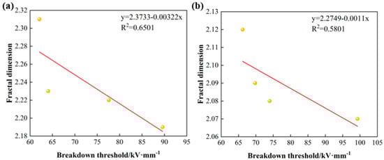 (3) The fractal dimension could be used to characterize the surface morphological properties and breakdown performance of the modified stainless steel electrode. The lower the complexity of the surface morphology, the smaller the fractal dimension of the modified electrode surface and the higher the breakdown threshold.