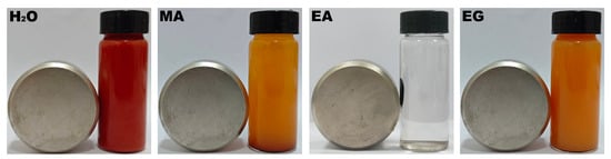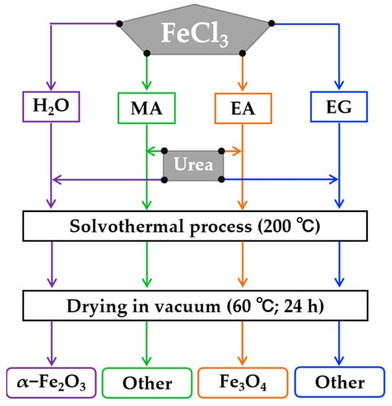 A simple solvothermal method, which did not involve a subsequent roasting process in a H2 atmosphere, was employed to synthesize magnetic Fe3O4, as referenced in our previous report []. Moreover, a flow chart of the synthesis procedure of samples was employed, as shown in Figure 1. In brief, FeCl3 (10 mmol) and the desired amounts of urea (0, 20, 40, 60, 80, 100, 120, and 140 mmol) were dissolved into 60 mL of different solvents (MA, EA, EG, and H2O) with stirring for 1.5 h. Subsequently, the mixed solution was decanted and sealed into a hydrothermal synthesis reactor with a capacity of 100 mL and kept at a temperature of 200 °C for various durations (3, 6, 12, 24, 36, and 48 h). After the reaction, the resulting precipitates were collected and washed with H2O and EA, then dried under vacuum at 60 °C for 24 h.