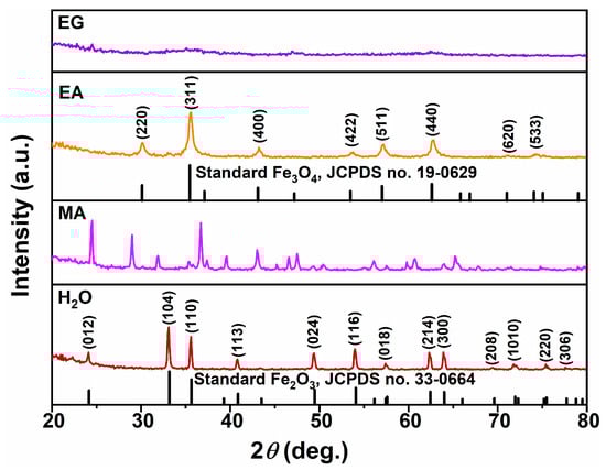 Figure 2 illustrates the XRD patterns of samples synthesized under different single-solvent systems (H2O, MA, EA, and EG) at 200 °C for 12 h with a urea amount of 80 mmol. In the reaction media of the H2O and EA systems, the XRD patterns revealed distinct diffraction peaks consistent with standard hexagonal α−Fe2O3 (hematite, JCPDS no. 33-0664) and standard cubic Fe3O4 (magnetite, JCPDS no. 19-0629). The Miller indices corresponding to each diffraction peak were also indicated, as illustrated in Figure 2. This suggests that the predominant components of the resulting samples obtained in these two solvent systems were hexagonal α−Fe2O3 and cubic Fe3O4, respectively. In contrast, for the reaction medium of the MA system, numerous sharp diffraction peaks were observed in the XRD pattern, with no single phase matching any known standard from JCPDS. It can be inferred that this resulting sample was composed of at least two phases based on its chaotic diffraction peaks. Furthermore, when EG was used as the reaction system, a gentle curve was observed in the XRD pattern of the as-obtained sample, suggesting that it mainly consisted of an amorphous substance.