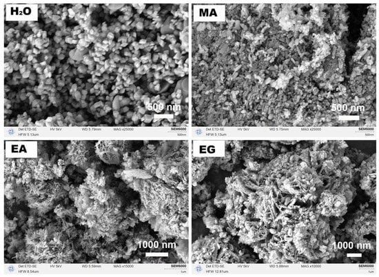SEM images of the samples synthesized under different single-solvent systems of H2O, MA, EA, and EG at 200 °C for 12 h with a urea amount of 80 mmol.