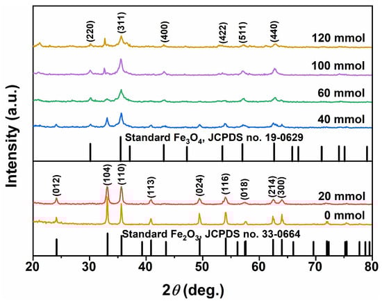 By utilizing EA as the reaction medium in the solvothermal process, the impact of urea addition on the phase composition and morphology of the resulting product was investigated. Figure 5 depicts the XRD patterns of the samples obtained from a gradient experiment involving urea addition. When no urea was added (i.e., 0 mmol), the XRD pattern of the resulting product matched that of standard hexagonal α−Fe2O3 (hematite, JCPDS no. 33-0664), indicating a single component product. With an addition of 20 mmol urea, although still displaying characteristic diffraction peaks of single-phase α−Fe2O3, there was a slight reduction in diffraction intensity compared to the α−Fe2O3 sample obtained without urea added. Upon increasing the urea addition to 40 mmol, a weak diffraction peak of cubic Fe3O4 was detected alongside characteristic diffraction peaks of α−Fe2O3. A further increase to 60 mmol resulted in dominant characteristic diffraction peaks of Fe3O4 with very weak characteristic diffraction peaks of α−Fe2O3, indicating that Fe3O4 became the main component. Subsequent increases in urea dosage to 100 mmol and 120 mmol led to samples consisting of mixtures containing both Fe3O4 and α−Fe2O3 phases.
