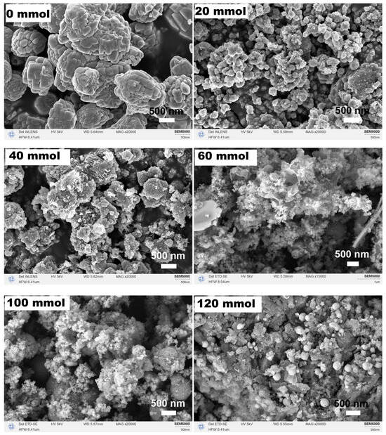 Figure 6 depicts the corresponding SEM images of the products. The morphology of α−Fe2O3 synthesized without the addition of urea consisted of an elliptic aggregate formed by the directional self-assembly of numerous small particles with long axes measuring 600 nm. Upon the addition of 20 mmol urea, the size of α−Fe2O3 particles decreased, with a single particle measuring approximately 300 nm, while the particle size in the sample with 40 mmol urea exhibited differences. As the amount of urea was increased to 60 mmol, the grainy particles disappeared and were replaced by wrinkled shredded paper-like structures, accompanied by a large number of bumps on their surfaces, which transformed into needle-like substances as the urea addition reached 80 mmol (see Figure 3). Subsequently, increasing the amount of urea to 100 mmol and then to 120 mmol resulted in the disappearance of the needles and their replacement by particles of varying sizes.