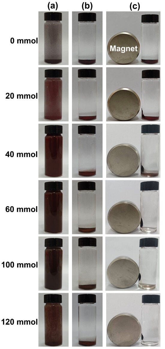 Magnetic response behaviors of the samples synthesized in an organic solvent system using EA at 200 °C for varying durations (3, 6, 24, 36, and 48 h) with a urea amount of 80 mmol: (a) A powder sample weighing 0.1 g was dispersed in a solution of 30 mL H2O using ultrasound for a duration of 5 min. (b) The mixture was then allowed to stand for 6 h. (c) Finally, a Nd−Fe−B magnet was placed on one side of the vial for 10 s.