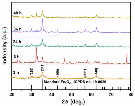 Combined with the above XRD phase composition analysis and SEM morphology analysis, it was determined that the product obtained through a solvothermal reaction at 200 °C for 12 h using EA as the reaction medium and adding 80 mmol of urea was pure Fe3O4, exhibiting a unique acicular interwoven aggregate morphology. Subsequently, the impact of solvothermal reaction time on the phase composition and morphology of the product was further investigated. Figure 8 presents the XRD patterns of the products obtained at 200 °C after varying solvothermal reaction times with EA as the reaction medium and 80 mmol of urea added. The XRD pattern of the sample obtained after a solvothermal reaction time of 3 h displayed four faint diffraction peaks consistent with standard cubic Fe3O4 (magnetite, JCPDS no.19-0629), indicating incomplete crystallization and poor crystallinity. As the reaction time extended to 6 h, 36 h, and 48 h, additional distinguished diffraction peaks appeared alongside those characteristic of cubic Fe3O4, suggesting that these samples contained other phases besides Fe3O4 and were not single-phase compositions. Notably, when the solvothermal reaction time reached 24 h, the XRD diffraction peaks corresponding to heterophase were relatively weak compared to that of the cubic Fe3O4 phase, indicating that cubic Fe3O4 was its main component. The results from XRD analysis in Figure 8 contrasted sharply with those in Figure 2; they provided valuable insights into process parameters for obtaining pure Fe3O4 with complete crystallinity, utilizing a reaction medium consisting of 60 mL EA along with an addition of 80 mmol urea during a solvothermal reaction lasting for 12 h at 200 °C.