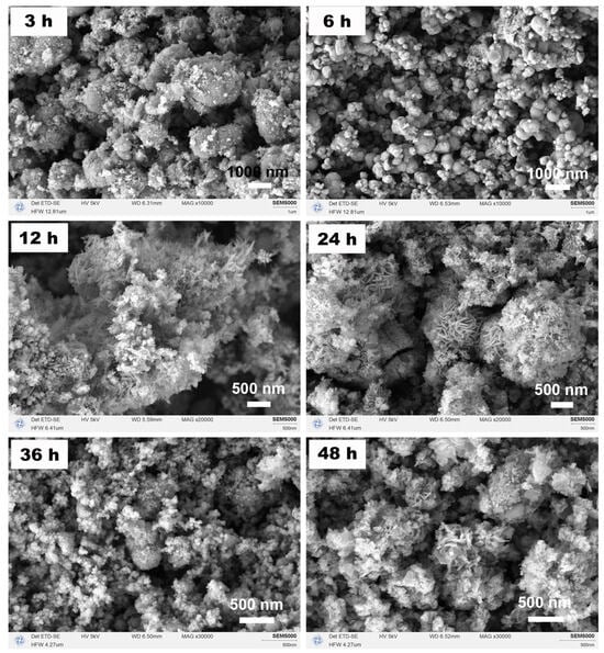 SEM images of the samples synthesized in an organic solvent system using EA at 200 °C for varying durations (3, 6, 12, 24, 36, and 48 h) with a urea amount of 80 mmol.