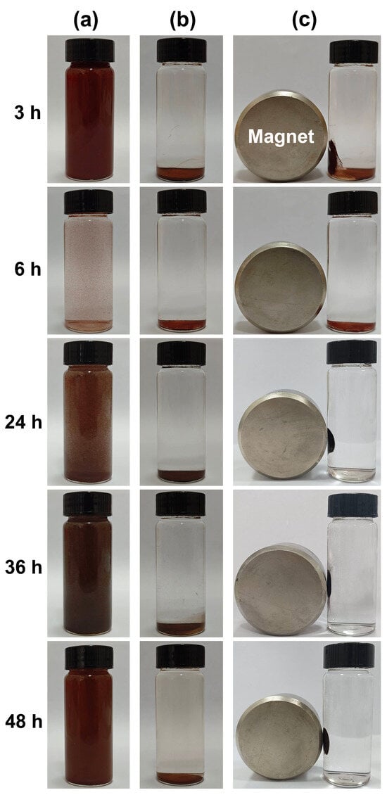 The resulting powder sample, weighing 0.1 g, was placed in a vial containing 30 mL of H2O. Subsequently, it underwent ultrasonic dispersion for 5 min and was allowed to stand for 6 h. Finally, a Nd−Fe−B magnet (Jinhua Yuanqiao Magnetic Industry Co., Ltd., Jinhua, China) was positioned on one side of the vial for a duration of 10 s. The dimensions of the vial were 27.5 mm in diameter and 72.5 mm in height; the Nd−Fe−B magnet measured 60.0 mm in diameter and 30.0 mm in height.