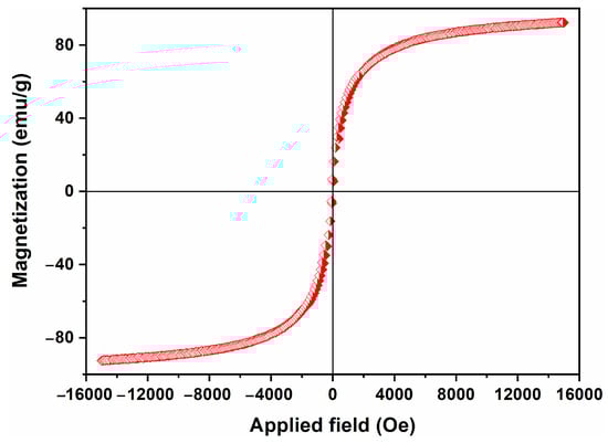 The magnetic hysteresis loop of the Fe3O4 synthesized in an organic solvent system using EA at 200 °C for 12 h with a urea amount of 80 mmol was measured using a VSM at room temperature. The applied magnetic field ranged from −15,000 to 15,000 Oe. As shown in Figure 11, the hysteresis loops nearly overlap, and they pass through the origin of the axes, indicating an absence of retentivity and coercivity. This observation suggests that the resulting Fe3O4 can be classified as a soft magnetic material exhibiting superparamagnetic properties. Furthermore, it was observed that the magnetization reached 92.2 emu/g at 15,000 Oe. This value is not only comparable to but also may even surpass those reported in other studies [,]. Such a finding highlights its exceptional magnetic sensitivity and serves as the foundation for its distinctive magnetic response behavior.