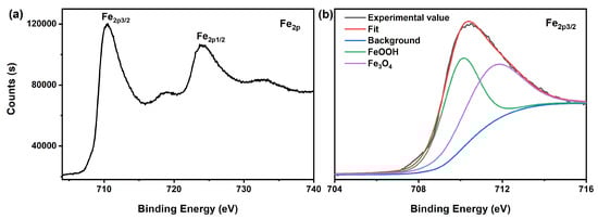 The surface properties of magnetic Fe3O4 synthesized in an organic solvent system using EA at 200 °C for 12 h with a urea amount of 80 mmol were investigated through XPS. As shown in Figure 12a, the peaks corresponding to Fe2p3/2 and Fe2p1/2 in Fe3O4 were observed at binding energies of 710.4 eV and 724.1 eV, respectively. This indicates the presence of nonequivalent Fe components existing within different chemical environments in the Fe3O4 samples. Furthermore, the Fe2p3/2 peak at 710.4 eV can be accurately characterized according to data from the NIST XPS Database (Version 4.1) as well as relevant literature [], as illustrated in Figure 12b. These findings provide clear evidence for the presence of the Fe3O4 phase within the magnetic sample, which is consistent with previous results obtained from XRD in Figure 2.