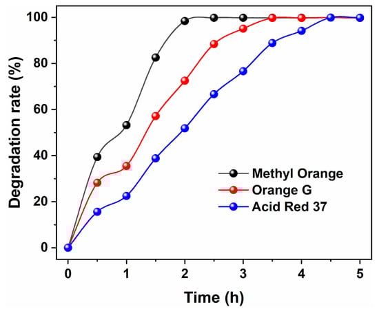 Based on the above analyses, it is evident that Fe3O4 with a unique morphology, complete crystallization, and excellent magnetic sensitivity can be obtained by utilizing EA as a solvent and adding 80 mmol urea at 200 °C for a solvothermal reaction lasting 12 h. Subsequently, the resulting magnetic Fe3O4 under these conditions was employed as a photocatalyst to assess its degradation effect on three azo dyes, including Methyl Orange, Orange G, and Acid Red 37. Figure 13 illustrates the curves depicting the photocatalytic degradation rate of the as-obtained Fe3O4 for Methyl Orange, Orange G, and Acid Red 37 dyes over time. As observed in Figure 13, the degradation rate of all three azo dyes was relatively rapid during the initial 0.5 h of the photocatalytic degradation reaction. This phenomenon might be attributed to both physical adsorption and photocatalysis occurring simultaneously onto Fe3O4. As UV light continued to irradiate, the degradation of all three dyes persisted. Almost complete degradation (D > 99%) of Methyl Orange dye was achieved after a photocatalytic reaction lasting for 2.0 h, whereas Orange G and Acid Red 37 dyes reached similar levels after reactions lasting for 3.5 and 4.5 h, respectively. It was noteworthy that Fe3O4 exhibited significantly better photocatalytic degradation effects on Methyl Orange compared to those observed with respect to Orange G and Acid Red 37. This difference in performance might be attributed to Methyl Orange having a smaller relative molecular weight compared to the other two dyes despite being an azo dye. Consequently, we selected Methyl Orange dye as our target for further investigation into the reuse performance of Fe3O4 catalysts.