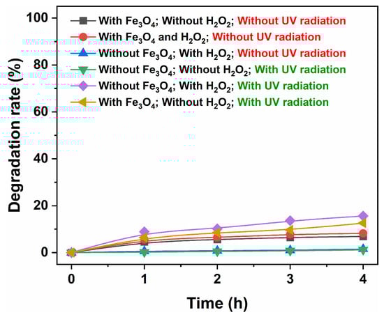 Figure 14 presents six controlled experiments investigating the degradation of Methyl Orange. In the scenario where only Fe3O4 catalyst was used, without H2O2 and UV radiation, the degradation rate of Methyl Orange after 4 h was merely 6.9%. This indicates that the dark adsorption effect of Fe3O4 on Methyl Orange was minimal. When both the Fe3O4 catalyst and H2O2 were present without UV radiation, the degradation rate at 4 h increased to 8.2%. Conversely, in the presence of only H2O2, the degradation rate remained low at just 1.5%. These results suggest that while H2O2 exhibits a limited capacity for degrading Methyl Orange, UV radiation plays a crucial role in enhancing the catalytic activity of Fe3O4. In an experiment involving solely UV radiation, the degradation rate of Methyl Orange over a period of 4 h was found to be only 1.2%. However, under UV radiation exposure, H2O2 managed to degrade up to 15.6% of Methyl Orange, whereas Fe3O4 catalyst achieved a degradation rate of 12.6% for Methyl Orange when subjected to UV radiation. The findings indicate that both Fe3O4 and H2O2 exhibit some degree of effectiveness in degrading Methyl Orange under UV irradiation; however, this effect remains relatively weak. These controlled experiments further corroborate the mechanism underlying photo-Fenton-type reaction, as in our previous reports [,].